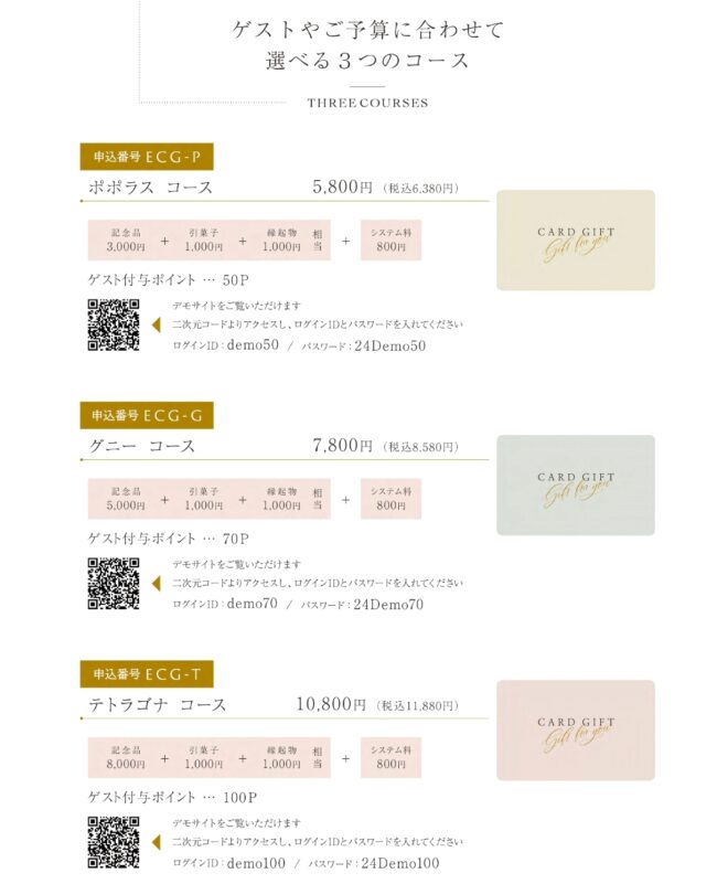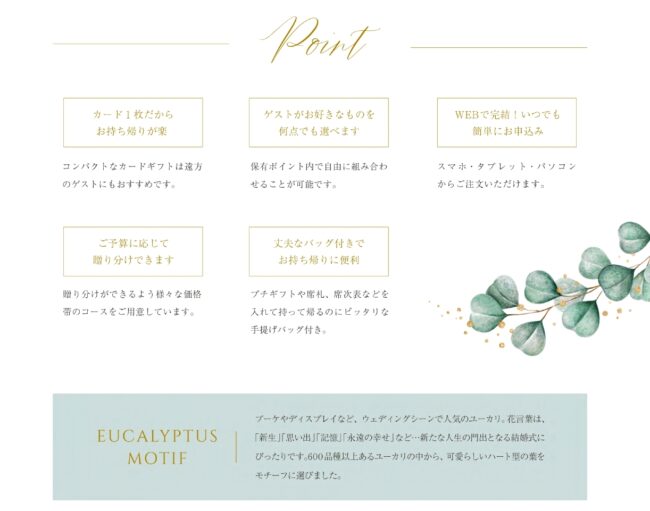 ゲストは付与されたポイントの中でお好きな商品を自由な組み合わせで選ぶことができます。