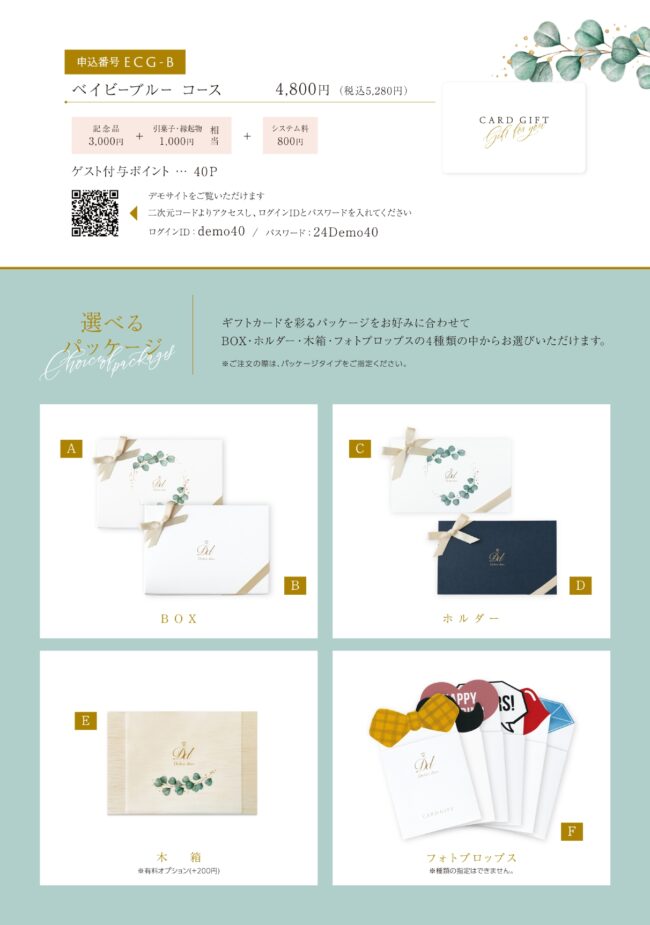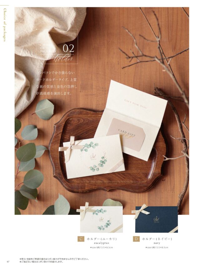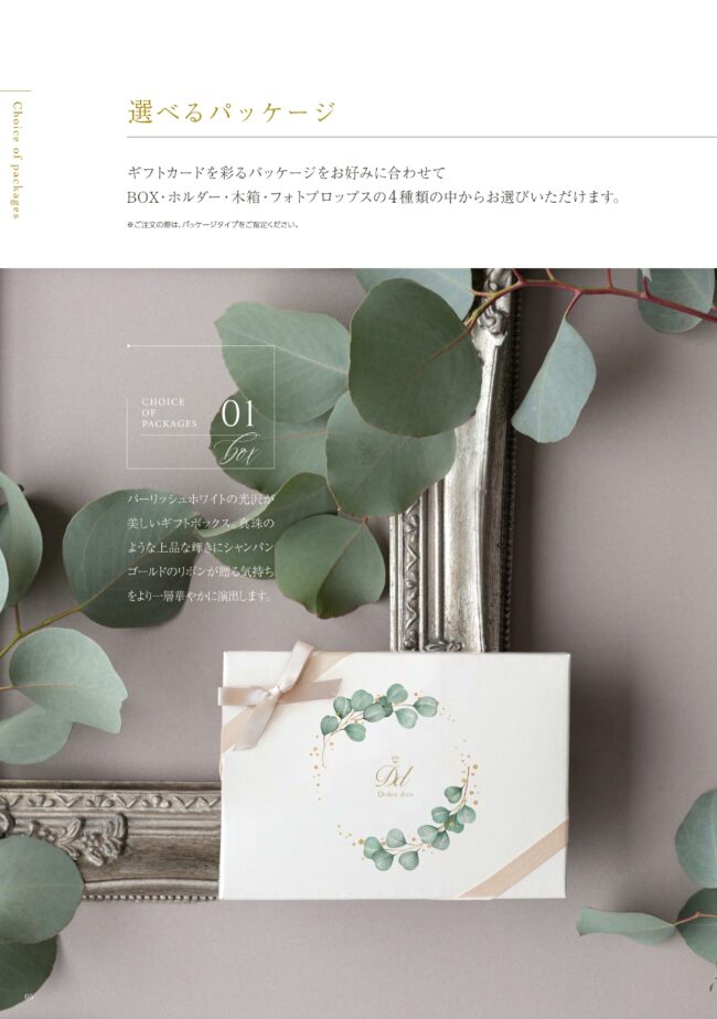 ギフトカードを彩るパッケージをお好みに合わせてBOX・ホルダー・木箱・フォトプロップスの4種類の中からお選びいただけます。